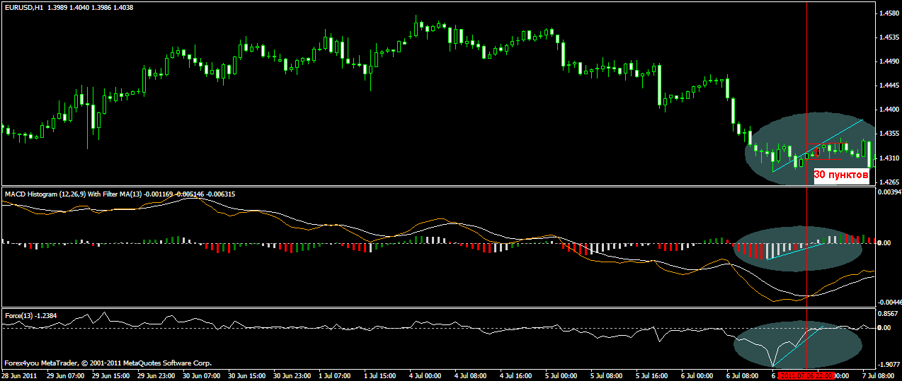 Дальше наконец рисуется великолепный сигнал на покупку! Хотел 100 пунктов, но тушканчик мой из далека тянул только 60-70... Думаю ну ладно хоть такой.... ниже на рисунки видно сигнал